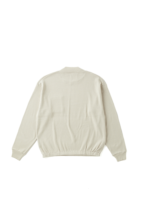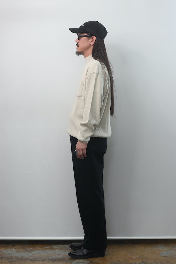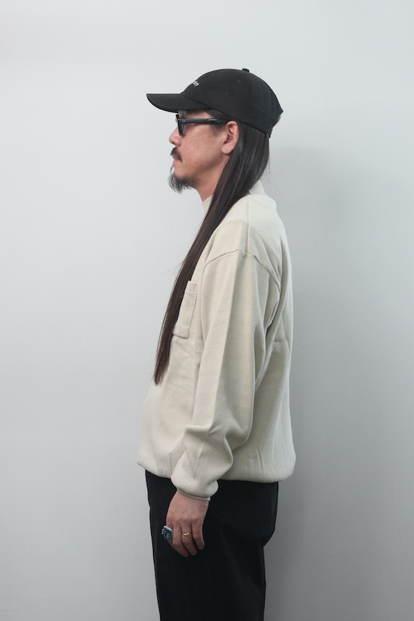 首にフィットするように設計され、編み立てられたモックネックリブに、 ゆとりを持たせた見頃と袖のバランスがモダンな雰囲気を見せる。