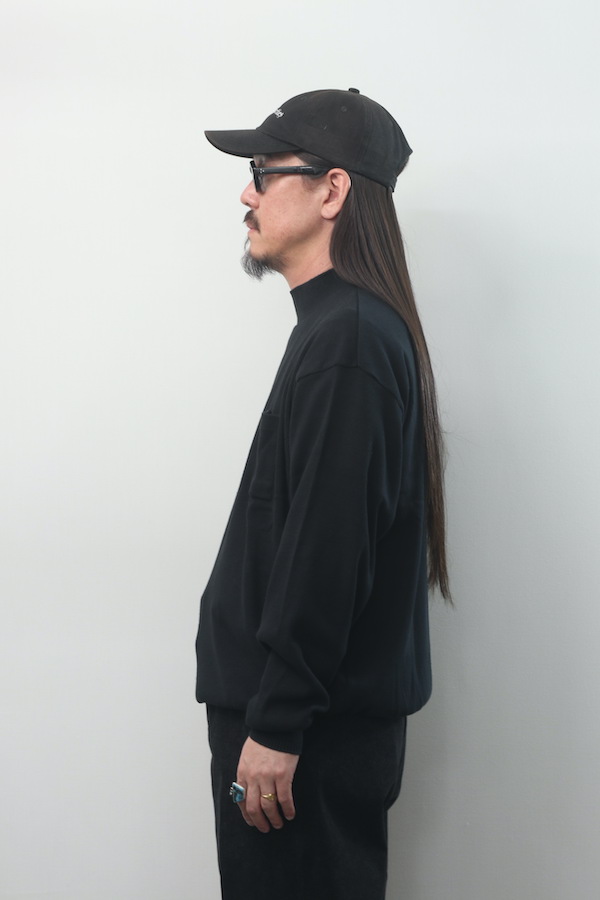 首にフィットするように設計され、編み立てられたモックネックリブに、 ゆとりを持たせた見頃と袖のバランスがモダンな雰囲気を見せる。