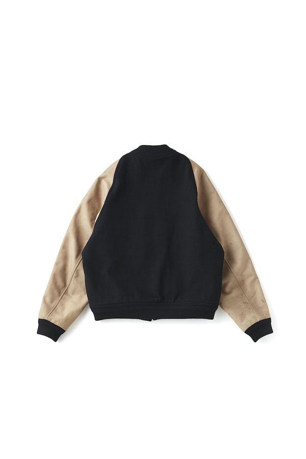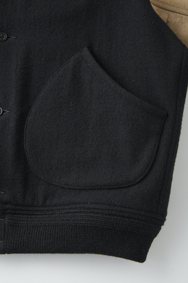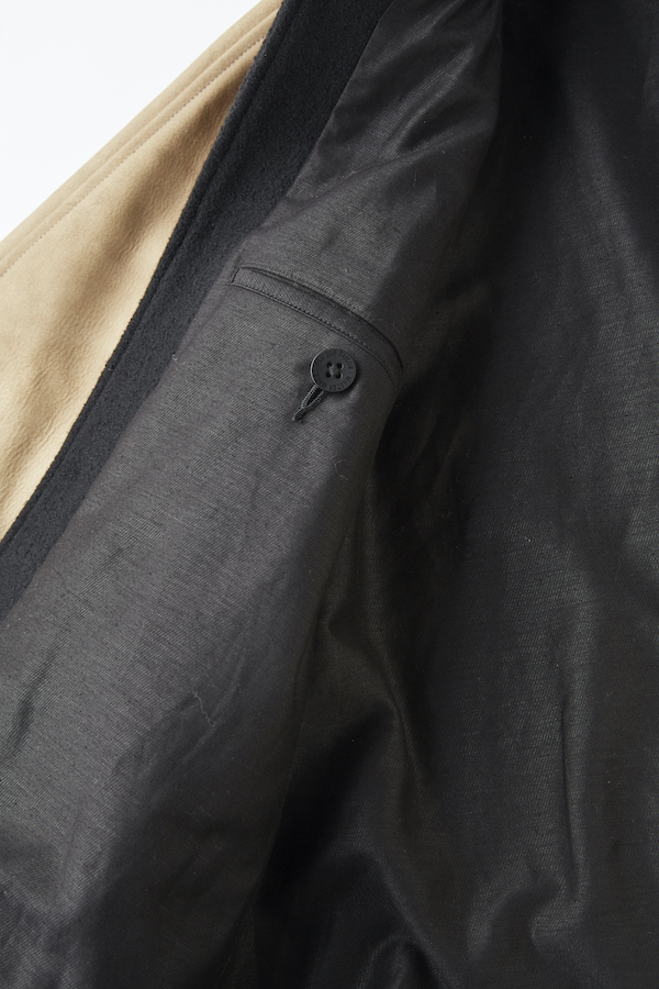 ユニークなラインを見せるラグラン切り替え、2種のウールをブレンドさせて編み立てたブークレーニットパーツ、3枚のパーツにより構成される立体的なスリーブはシュリンク作業を施したカウスキンを用いて組み立てられ、その後一点一点、手作業により味だしされます。