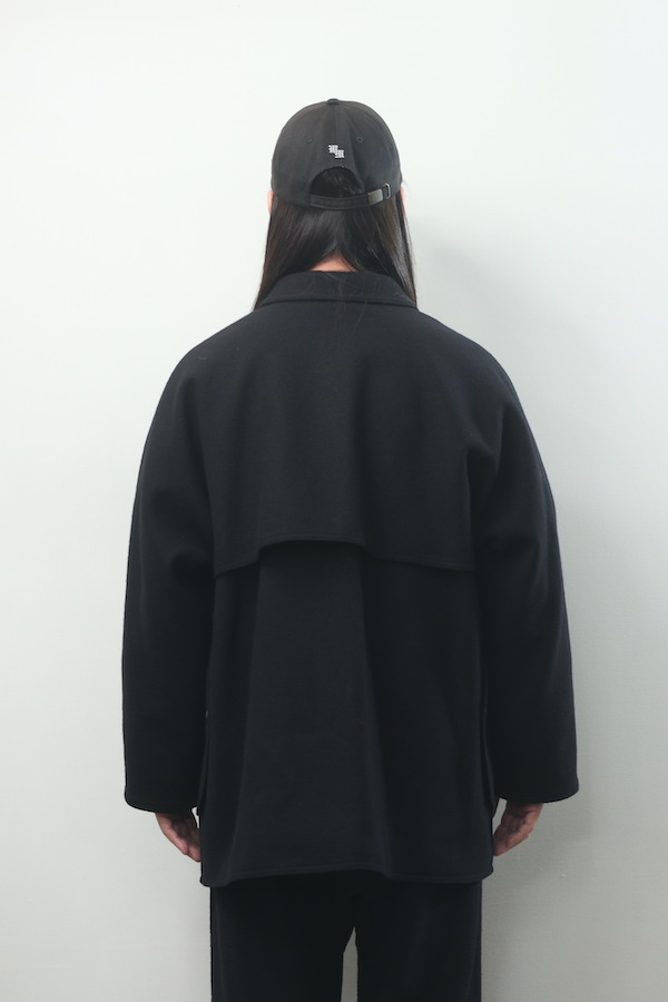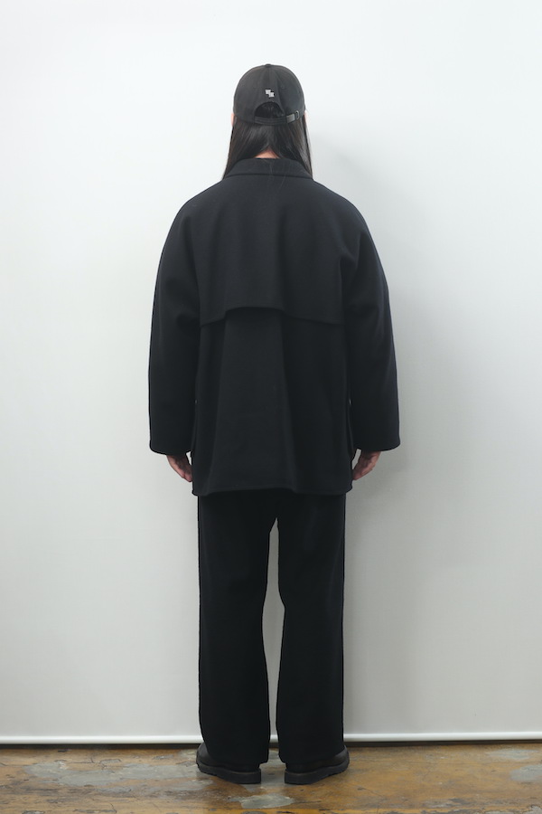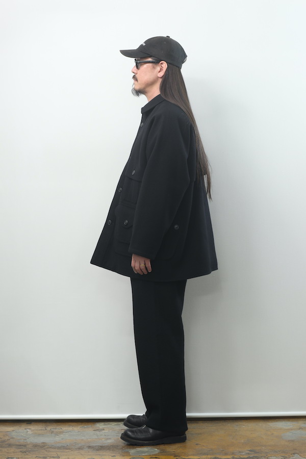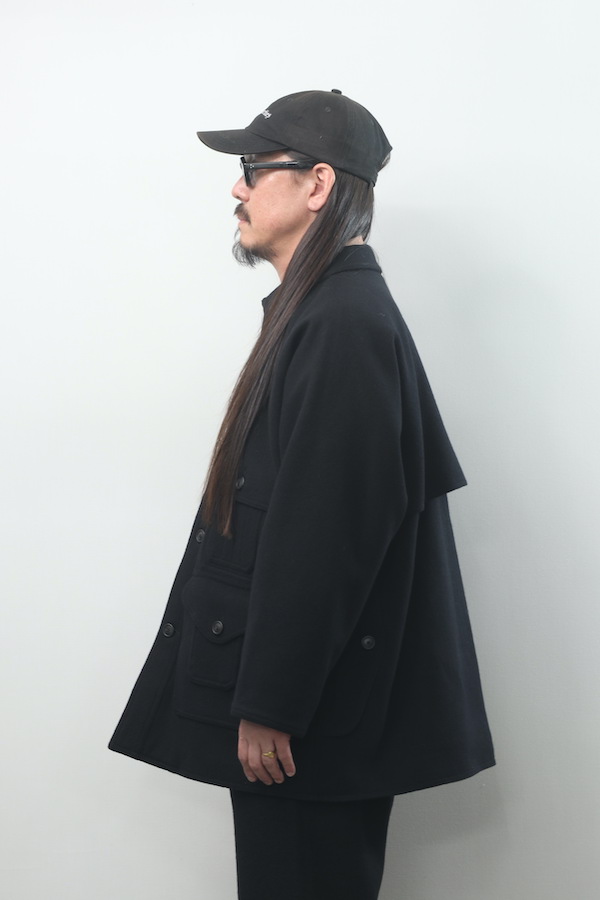 ブークレーヤーンを用いて織り上げたメルトンは不均一かつモダンな表情を持っており都市生活者のためのコンフォタブルなフィッティングラインは、アーカイブピースの持つそれとは別物でとても品の良い佇まいを見せる。
